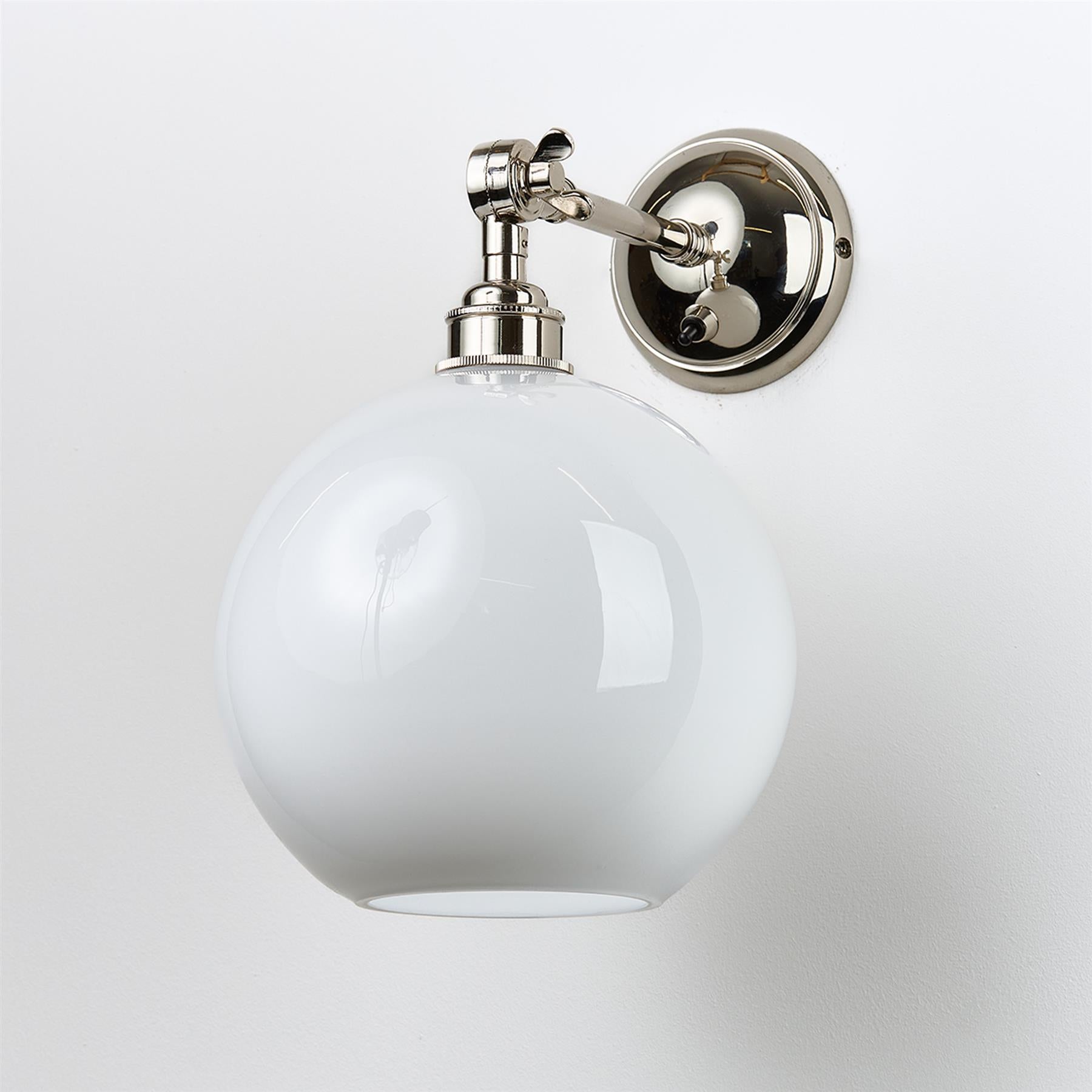 Our Adderley Wall Light blends friendly, easy styling with the practical beauty of adjustable lighting. Designed in-house by Mark Holloway and crafted here in the UK, it pairs a smooth white opal globe shade with a movable arm so you can set the light just how you like it — whether angled for reading, pointed toward artwork, or simply glowing gently in the background.