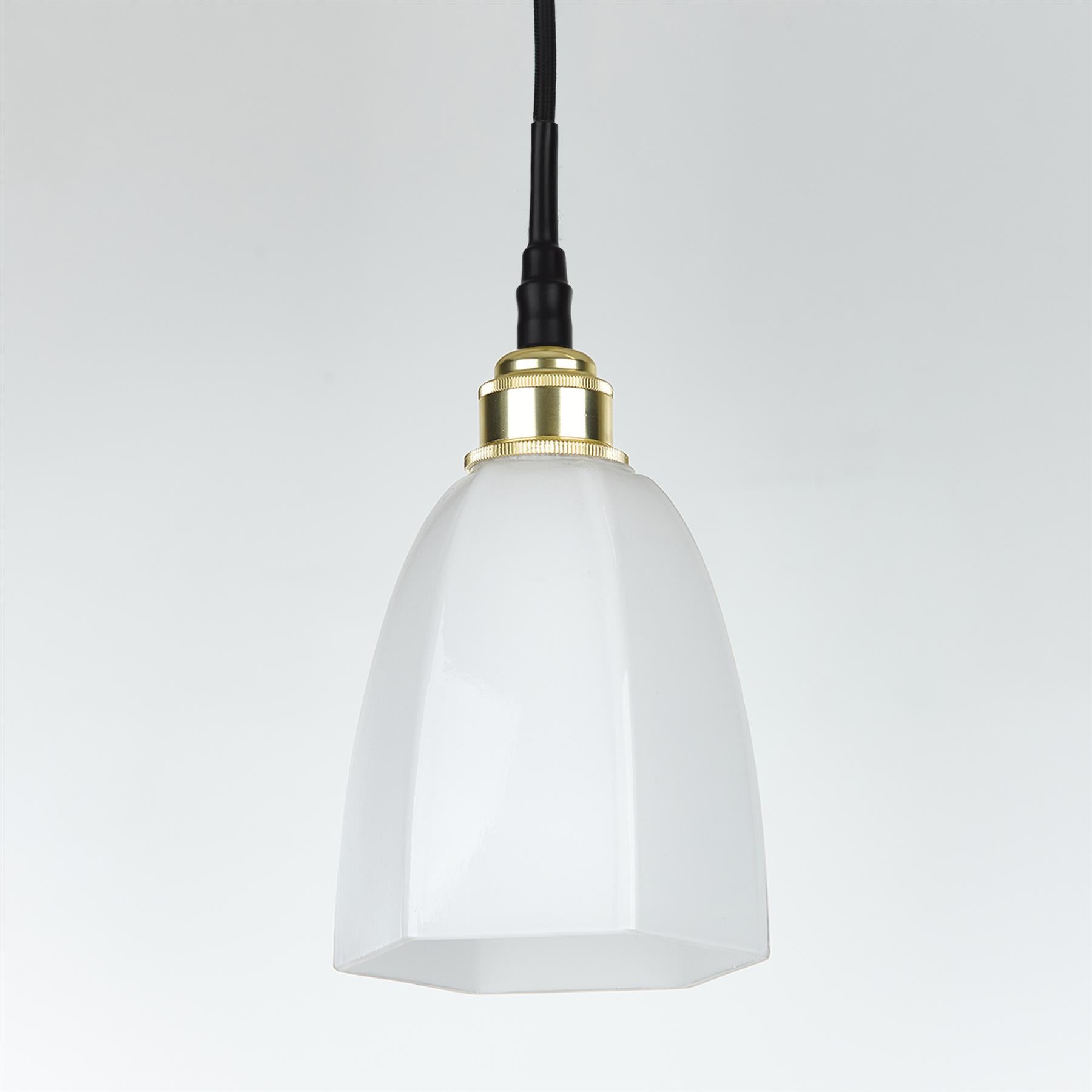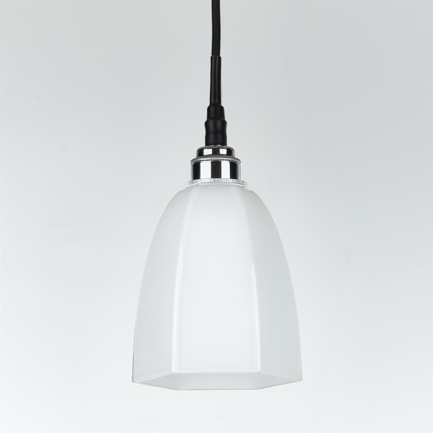 Our Hexagon Bathroom Pendant blends gentle opal light with a clean, geometric shape. Designed here in the UK by Mark Holloway, the six-sided shade (15cm × 10.1cm) gives bathrooms a crisp, modern look while still feeling soft and welcoming.