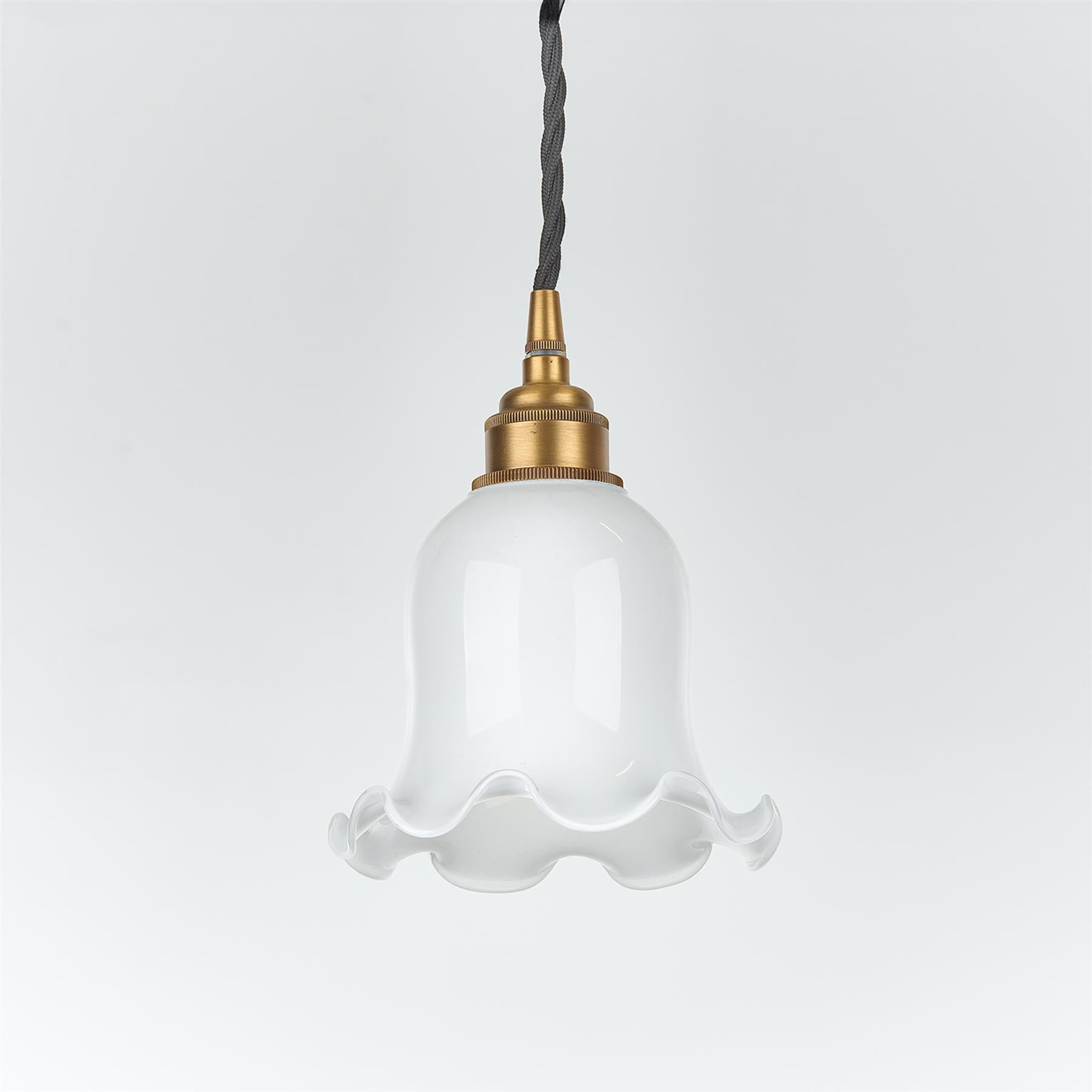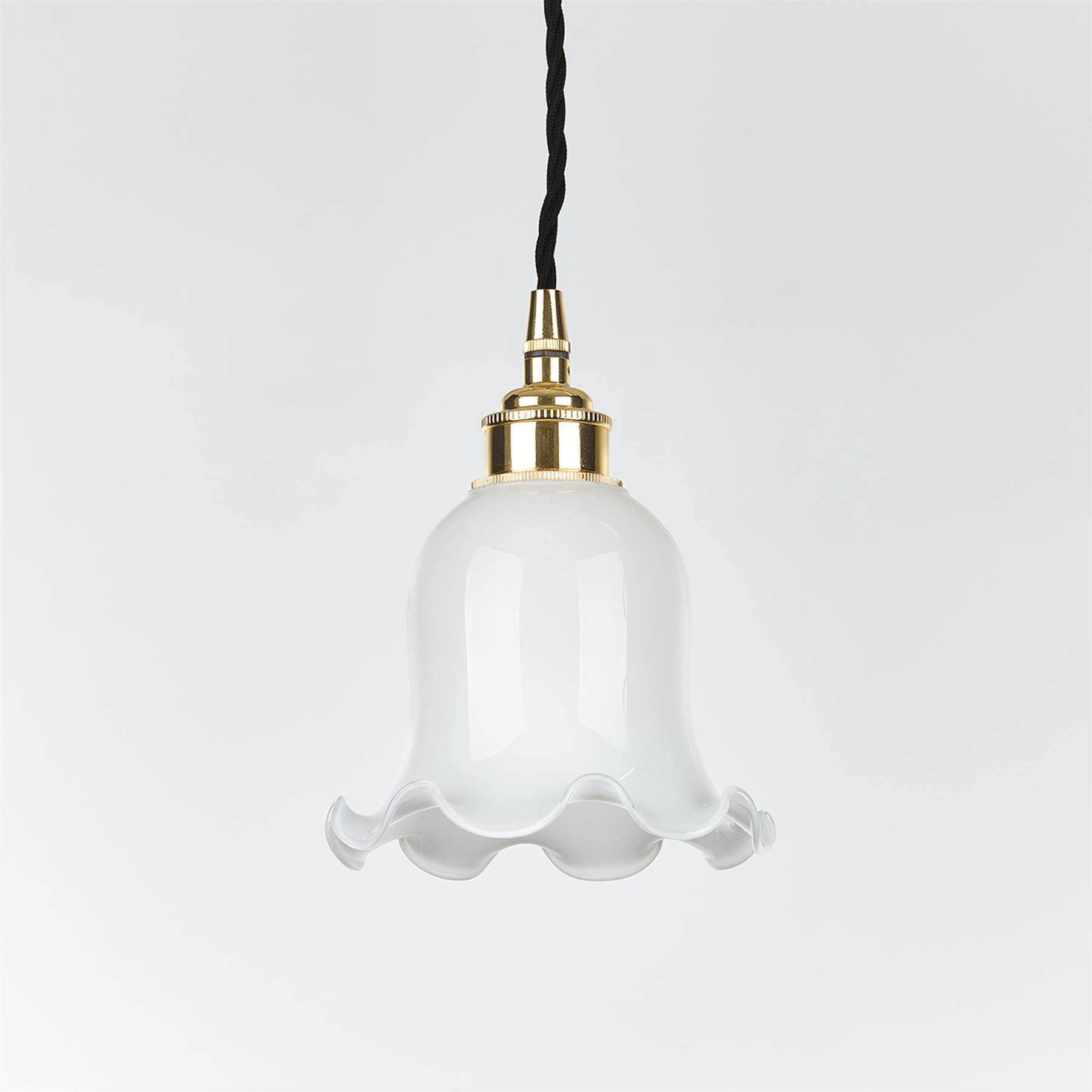 Our Tulip Pendant adds a soft, playful elegance to any room. Designed in the UK by Mark Holloway, its opal-glass shade has a smooth rounded body that opens into a wavy, petal-like edge — a gentle nod to the flower that inspired it. When lit, it gives off a warm, inviting glow that feels cosy and uplifting. The pendant hangs from a 1m fabric-twisted cable with a matching metal rose.
