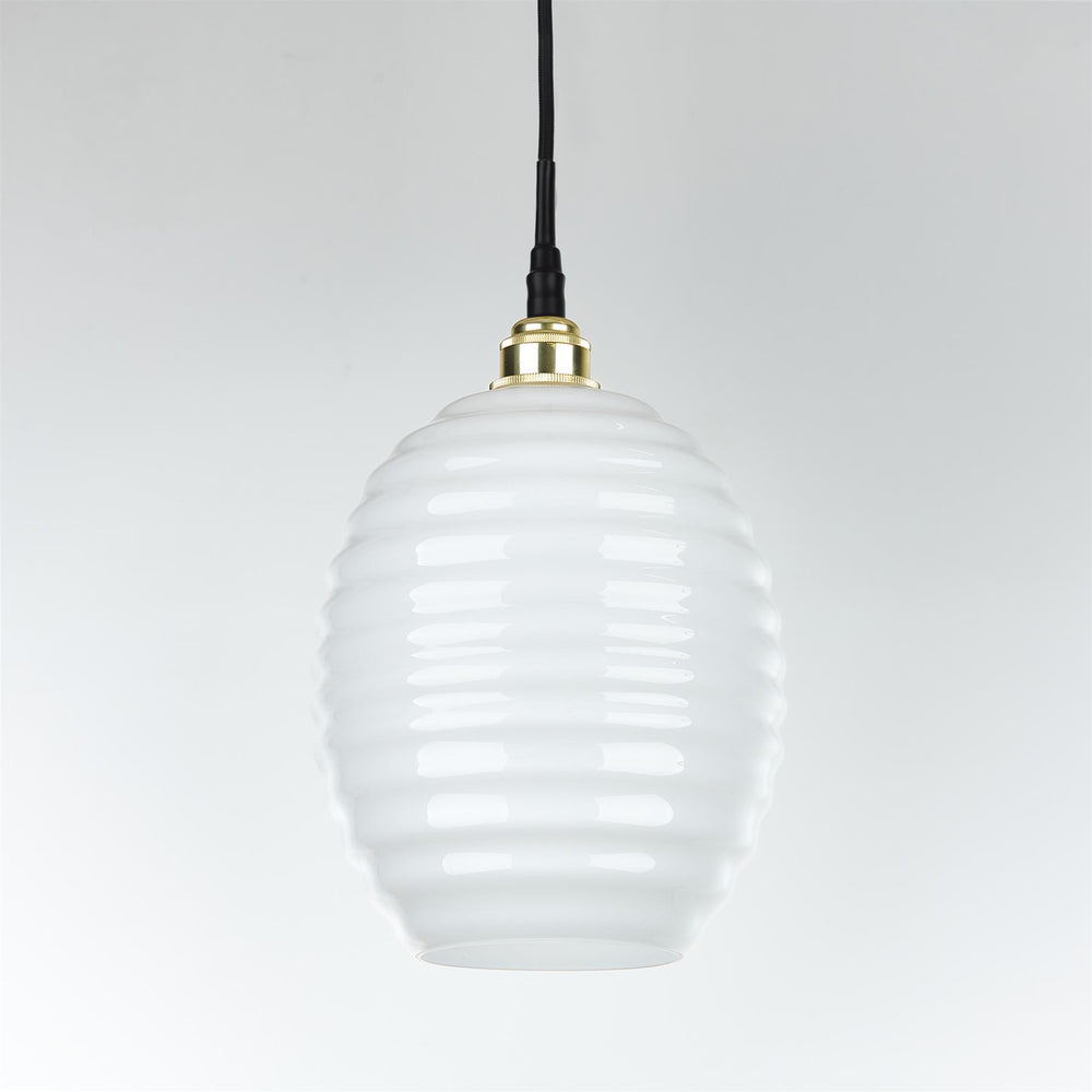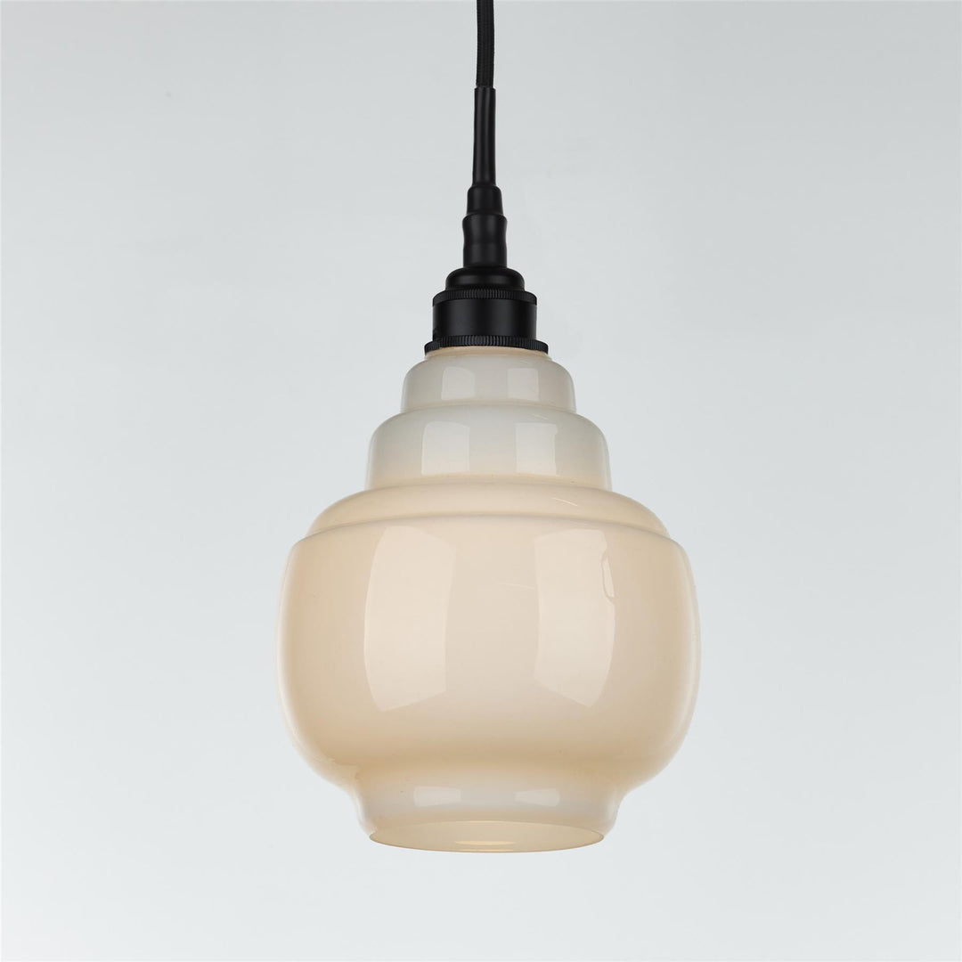 A living room with a yellow Deco Opal Glass Pendant by Old School Electric, timeless elegance, and a window.